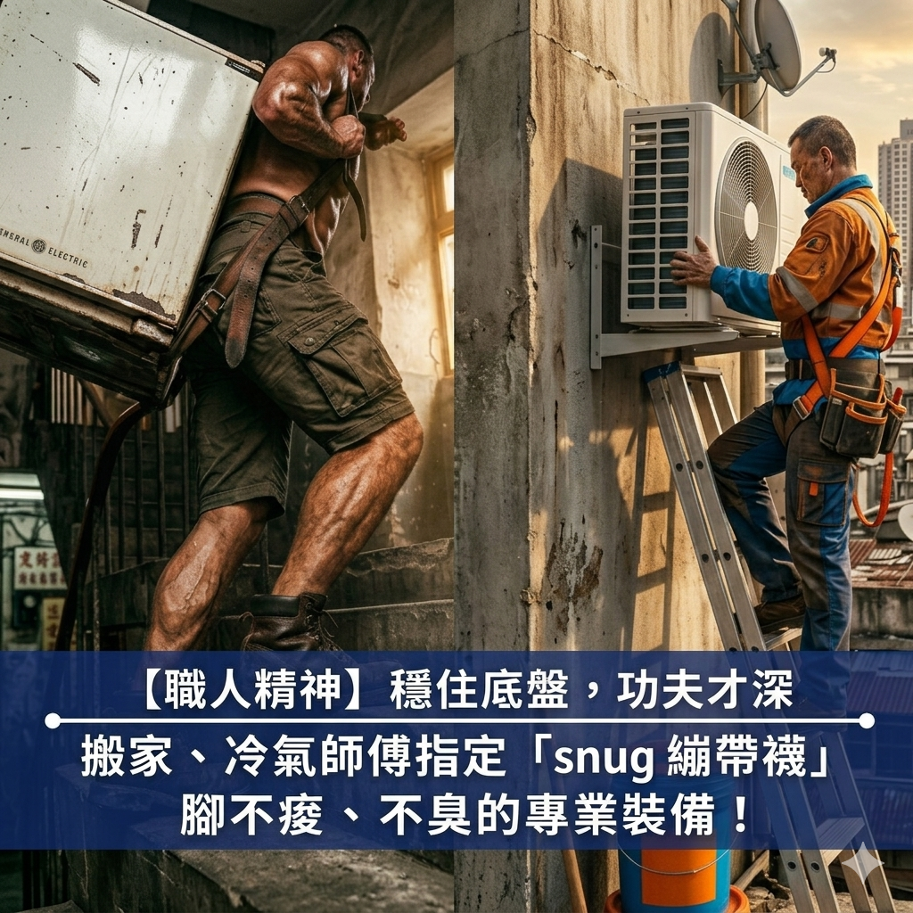 身為專業職人,我們都知道:「底子穩,出力才會猛。」不管是背著百斤冰箱爬五樓的搬家兄弟,還是站在窄梯上精密接管的冷氣大師,雙腳就是你最重要的生財工具。 長期負重、穿安全鞋悶一整天,收工後的腳痠與異味,不只是累,更是對身體的損耗與職業病的累積。 今天我們不只談襪子,談的是「足部護具」。 sNug 360度加壓繃帶襪,適合高強度工地與極端工作環境。 🚚 搬家大隊:負重前行的最強後盾「撐住家的重量,足弓我幫你扛。」搬家師傅在斜坡與樓梯間反覆位移,最怕腳踝虛浮、足底筋膜過度拉扯導致受傷。 專利 8 字繃帶(鎖住踝關節): 模擬物理治療的繃帶貼紮,像隱形護具般緊扣腳踝。在負重轉身、踏步時提供強力穩定,大幅降低扭傷風險。 黃金比例足弓支撐: 針對「負重受壓」強化織法,支撐下陷的足弓,分散背負重物時的瞬間衝擊力,顯著緩解收工後的腳底板緊繃與沈重感。 5 倍耐磨「工地等級」: 師傅走一天的路等於普通人走三天。我們針對腳趾與腳跟進行特製強化,比一般棉襪更耐操,禁得起高頻率摩擦,不再擔心穿幾次就破洞。 ❄️ 冷氣空調師傅:窄梯上的穩定專家「站得穩,冷氣才裝得準;脫下鞋,專業依舊在。」冷氣師傅常需長時間踩在梯槓上施工,腳掌受力點集中,更要面對進客戶家脫鞋時的「形象危機」。 全足底氣墊避震: 針對梯槓壓迫感設計加厚層,吸收硬物對腳底的直接擠壓,緩解長時間站立、攀爬造成的腳底板疼痛,讓你站得久、站得穩。 10 秒消臭奇蹟: 採用日本專利消臭纖維,非化學藥劑浸泡。即便穿著安全鞋在高溫室外機旁工作,進屋脫鞋瞬間異味即刻分解,維持職人應有的體面與專業。 瞬吸快乾科技: 極速排汗性能,確保腳趾間不濕黏、不打滑。在濕滑的施工環境中,保持雙腳乾爽就是保證施工安全的第一道防線。 📊 專業性能評比:為什麼職人捨棄一般棉襪?比較項目一般市售棉襪sNug 專業繃帶襪吸汗乾爽度易濕悶,流汗後會滑動纖維自我乾燥特性,整天乾爽耐穿程度腳趾、腳跟易磨破氣墊式加厚設計,耐穿抗磨異味處理鹹魚味重,洗幾次就失效10 秒分解臭分子,永久有效防護支撐力無支撐,容易足部疲勞360 度足弓與踝關節強效加壓你的專業,值得更好的支撐工作時的汗水是榮譽,但留下的酸痛與異味不該由你默默承擔。sNug 專業繃帶襪 不只是一雙襪子,更是你在工地、樓梯間與客戶家中,最可靠的無聲戰友。 「穿對襪子,是為了走更長遠的路。」投資一雙能真正守護雙腳、提升工作效率的「足部護具」。現在就為自己換上職人專屬的裝備,感受腳底前所未有的穩固與乾爽!立即升級你的裝備:sNug 360度加壓繃帶襪 【sNug 品牌直營銷售據點】台中旗艦體驗館|台中市南區忠明南路 760 號 B1遠東百貨 信義 A13|7F 專櫃新北中和環球購物中心|2F 專櫃遠東百貨 竹北店|4F 專櫃秀泰生活 台中文心店|2F 專櫃台中麗寶 OUTLET(B 區)|2F 專櫃南投半山夢工廠 |8F專櫃高雄義享時尚廣場|5F 專櫃