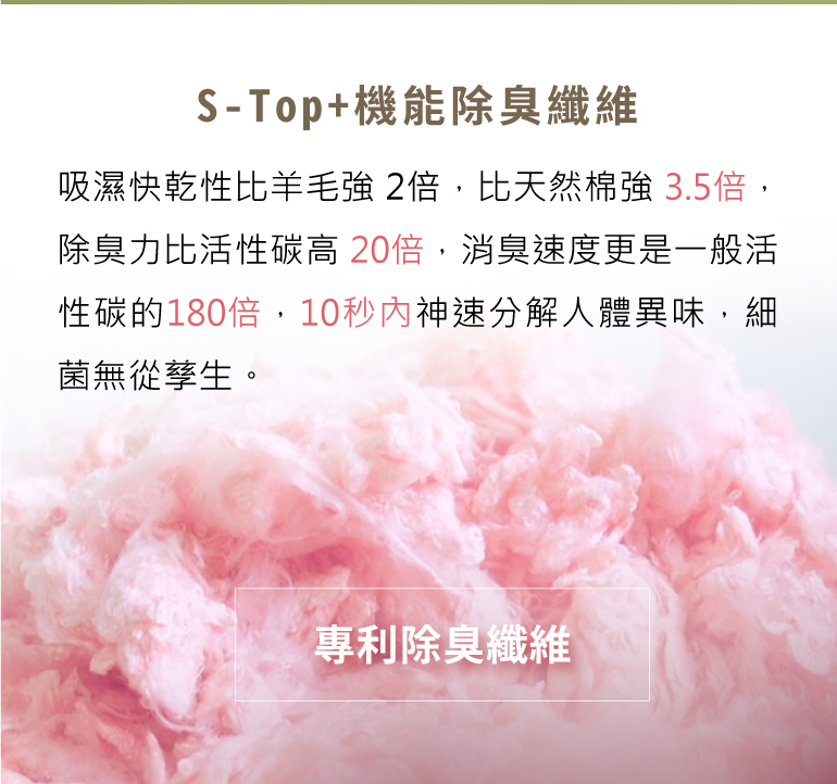 獨家S-TOP+ 複合科技纖維/透氣/防菌/除臭/彈性避震