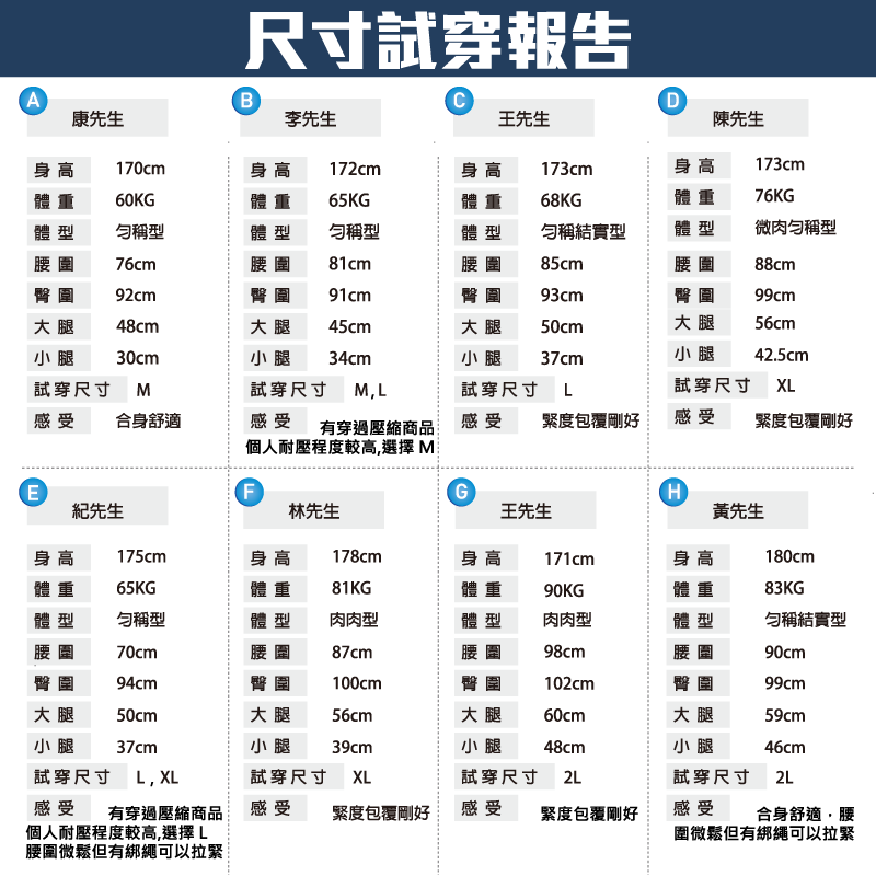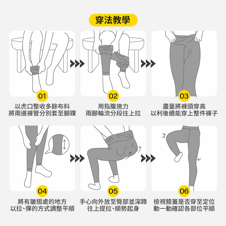 選對尺寸對於壓縮褲的效果至關重要!太緊的壓縮褲會限制活動度,長時間穿著會不舒服並影響血液循環。而太鬆的壓縮褲則失去了加壓的功能,與不穿著沒有差別。因此,一定要仔細測量自己的腰圍、臀圍、大腿及小腿圍,再比對尺寸表選擇適合的尺寸才能達到最佳效果。