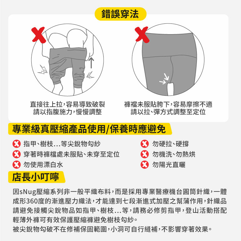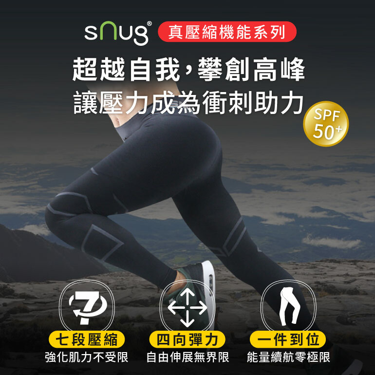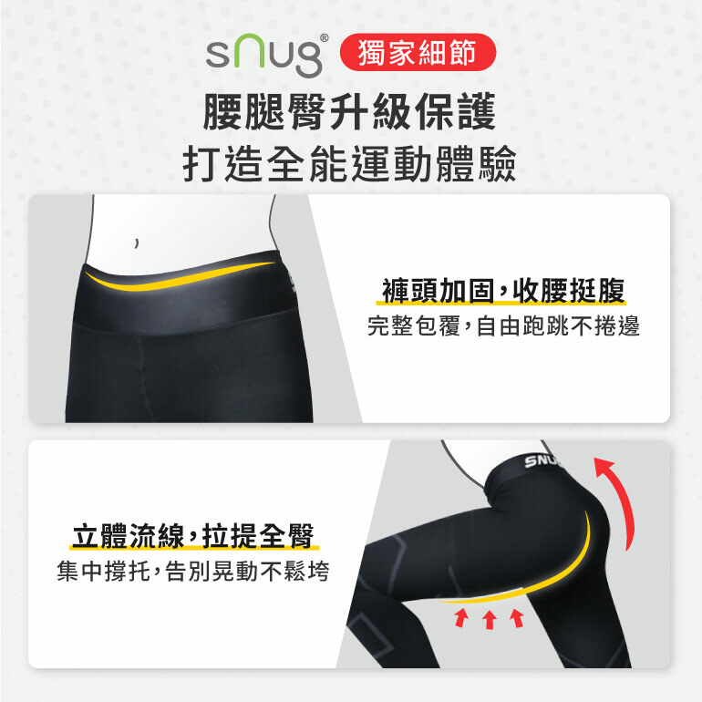sNug全壓式強肌力壓縮褲具有極佳的彈性,使用杜邦萊卡材質並採用360度圓筒編織,活動時不會影響雙腿的伸展,同時也不會阻礙血液循環。可以減少運動時的肌膚摩擦,穿著舒適貼身,同時能修飾身形,也可以當作日常內搭褲穿著。