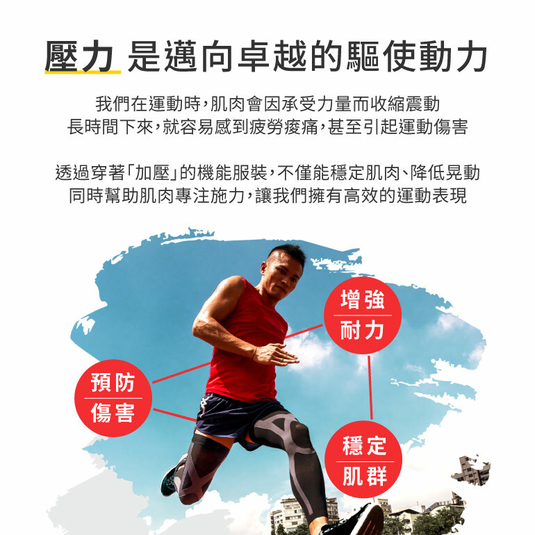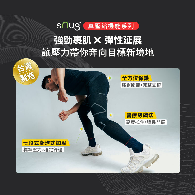 在運動過程中,肌肉因為負荷力量而收縮和震動,這會導致疲勞和甚至抽筋。sNug全壓式強肌力壓縮褲,沿著肌肉纖維施加壓力,有助於穩定肌肉,避免晃動,減輕雙腿疲勞和運動傷害,同時提高運動持久力。