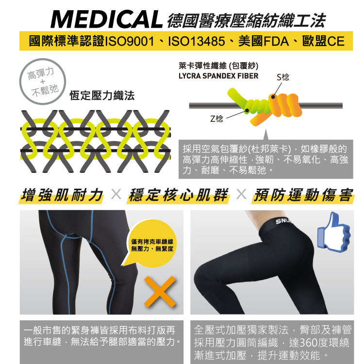 sNug全壓式強肌力壓縮褲具有極佳的彈性,使用杜邦萊卡材質並採用360度圓筒編織,活動時不會影響雙腿的伸展,同時也不會阻礙血液循環。可以減少運動時的肌膚摩擦,穿著舒適貼身,同時能修飾身形,也可以當作日常內搭褲穿著。