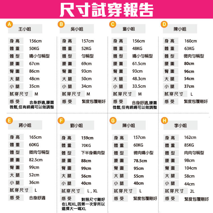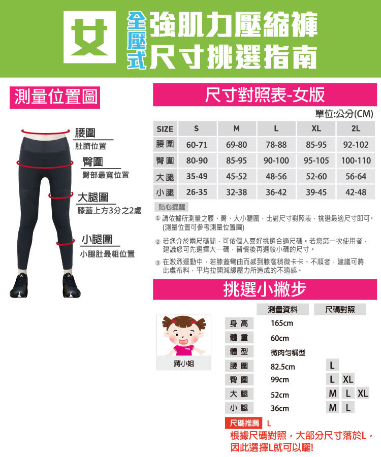 選對尺寸對於壓縮褲的效果至關重要!太緊的壓縮褲會限制活動度,長時間穿著會不舒服並影響血液循環。而太鬆的壓縮褲則失去了加壓的功能,與不穿著沒有差別。因此,一定要仔細測量自己的腰圍、臀圍、大腿及小腿圍,再比對尺寸表選擇適合的尺寸才能達到最佳效果。