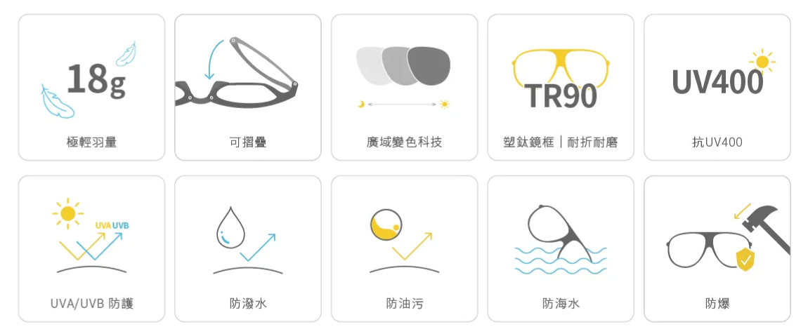 跑步爬山越野休閒,一支抵多支。僅18g,戴在臉上輕到忘記它的存在,超薄高敏度變色片,鏡片深度隨著紫外線變化,摺疊鏡型易於收納