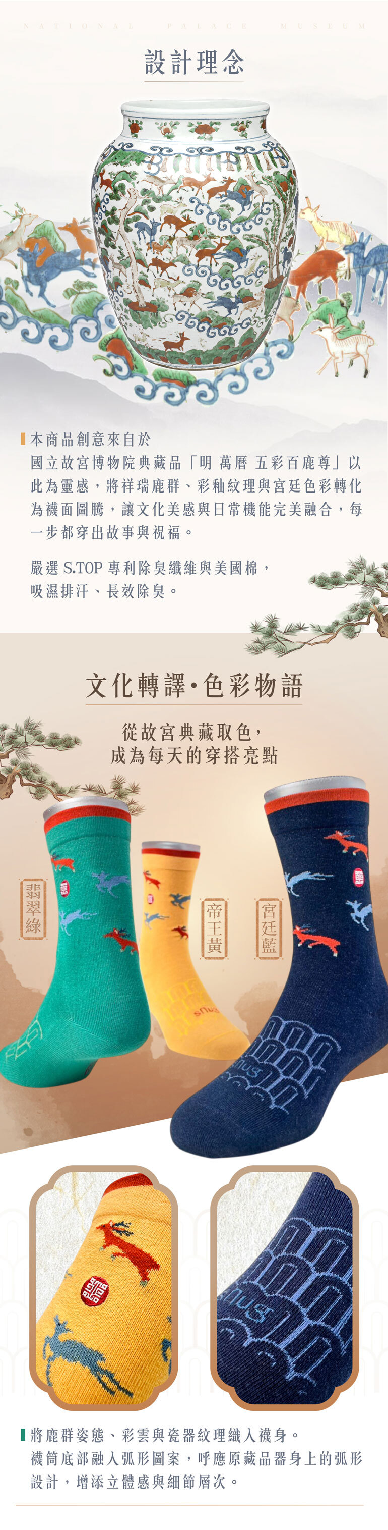 【故宮博物院聯名】五彩百鹿尊健康機能襪-帝王黃