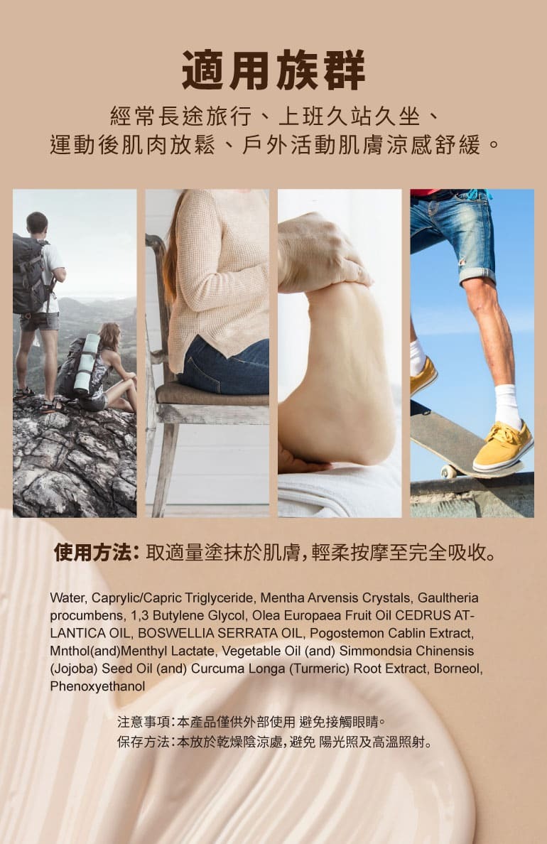 適於運動後肌肉放鬆及戶外活動肌膚涼感舒緩。
