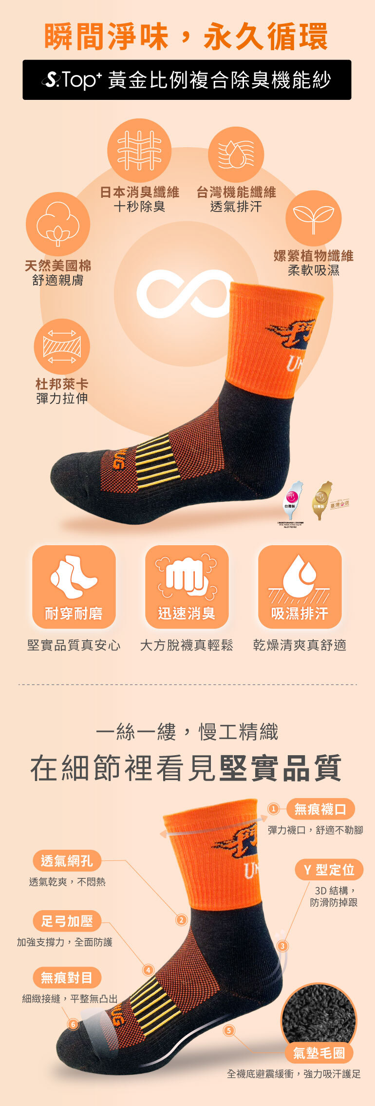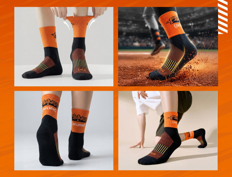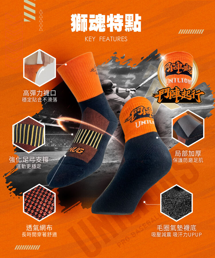 統一獅口號「鬥陣起行」聯名中筒運動襪,採橘黑經典配色設計,搭配厚底避震結構,提供舒適支撐與穩定腳感。