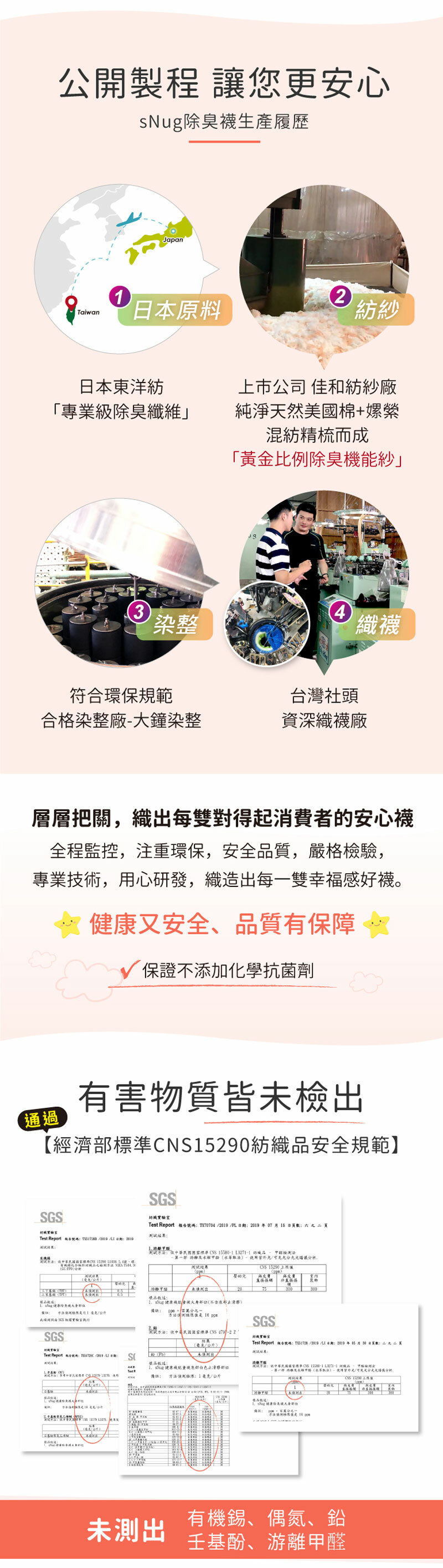 給孩子的第一雙襪,自主送驗CNS15290紡織品安全規範,無甲醛、無偶氮、0有害物質。
