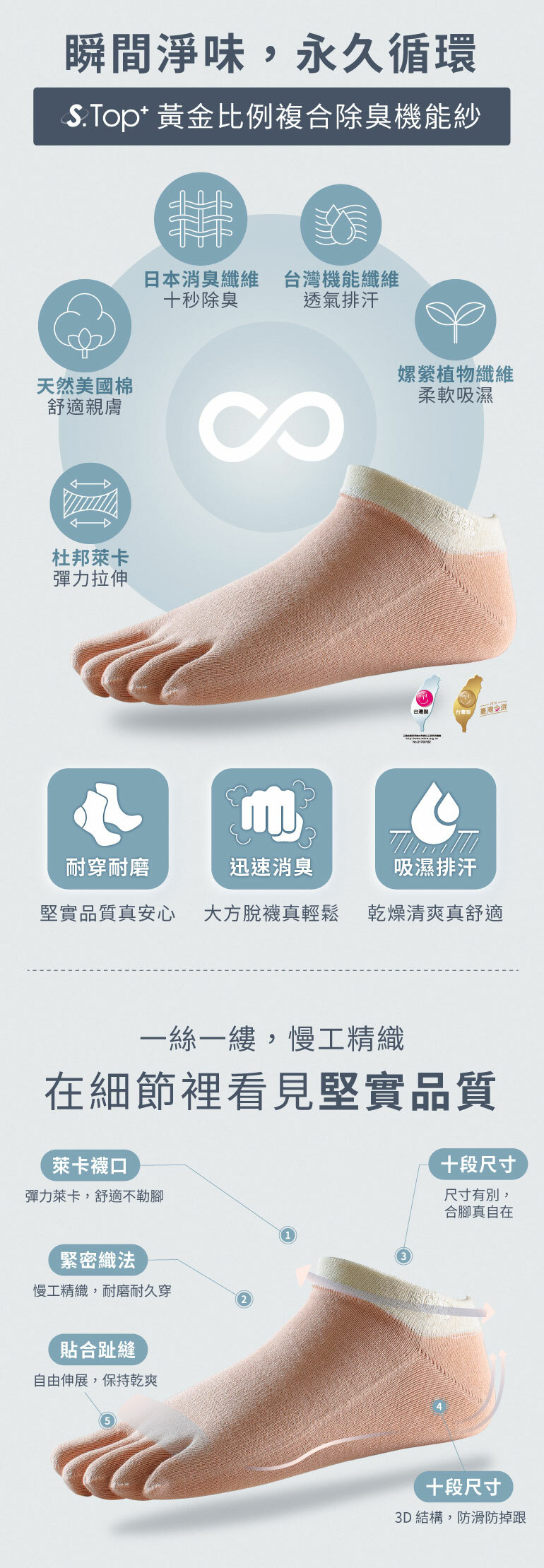 依照人體工學趾頭長度織造,讓每個趾縫都能完全服貼,吸收趾縫的汗水保持乾爽。