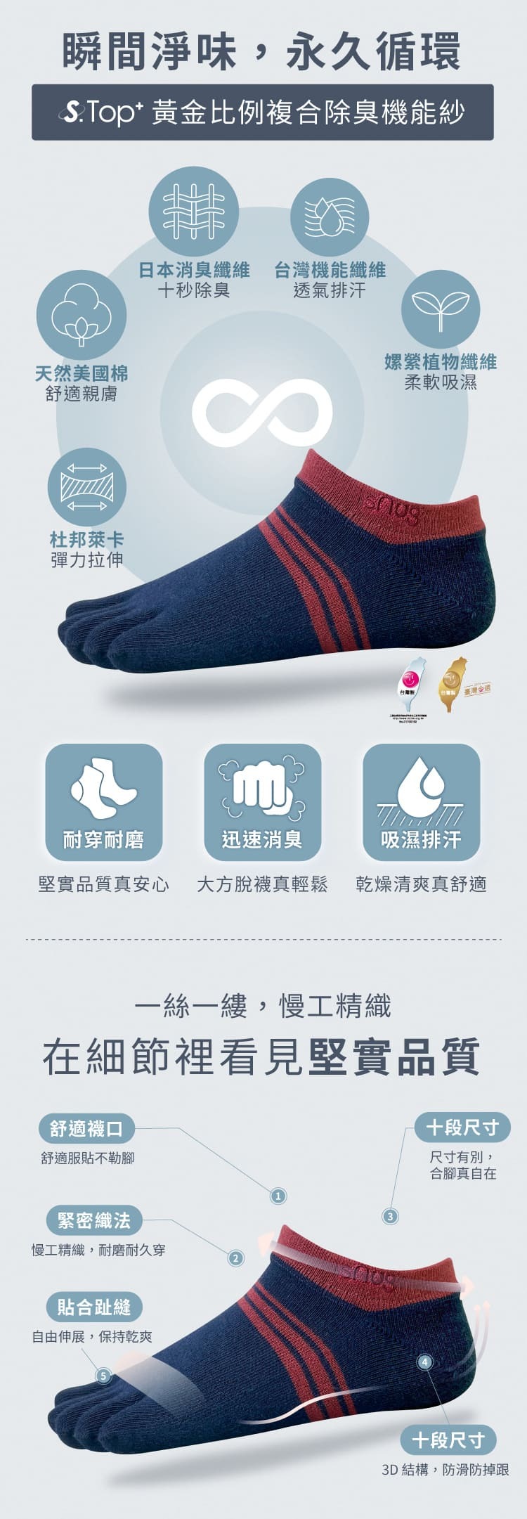 依照人體工學趾頭長度織造,讓每個趾縫都能完全服貼,吸收趾縫的汗水保持乾爽。