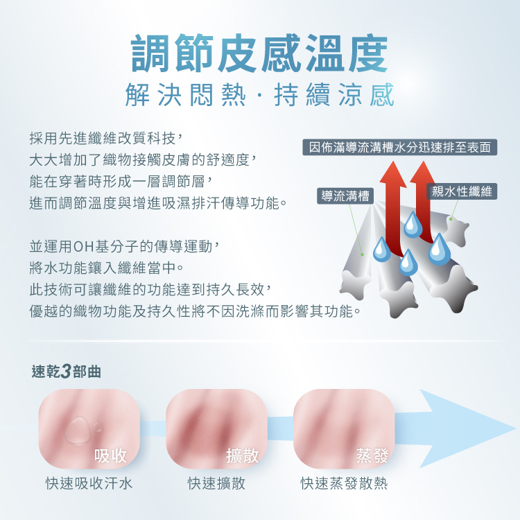 高彈性、持續涼、快乾、超細低敏、不皺不縮