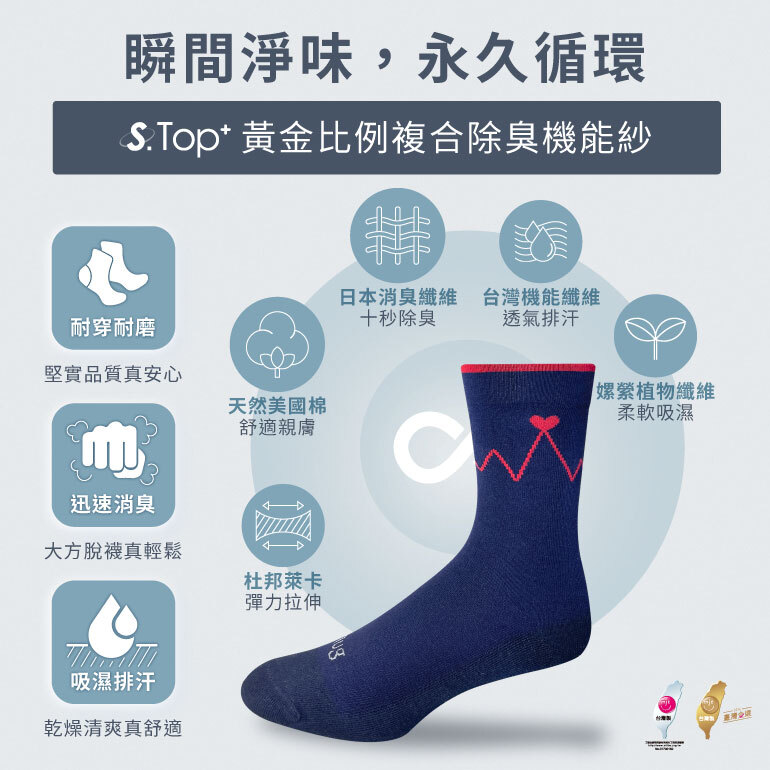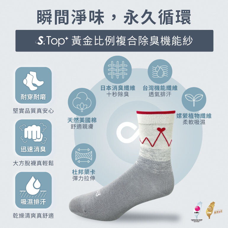 MIT 台灣製,獨家 S-TOP+ 除臭纖維,10 秒快速分解異味,陪伴你們從心動到日常。