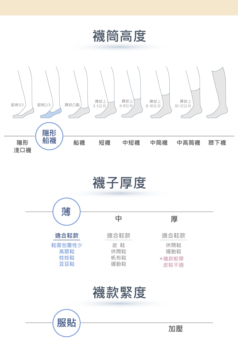 隱形船襪(深口-約腳背2/3處)比船型襪襪口低一些,一般休閒鞋、不想要露出襪子的鞋子都適合穿喔