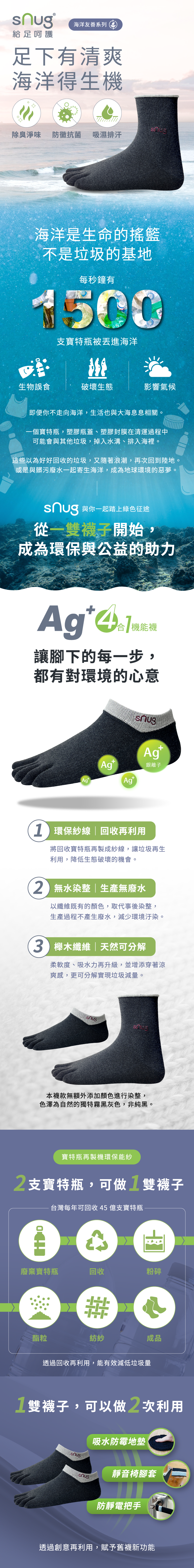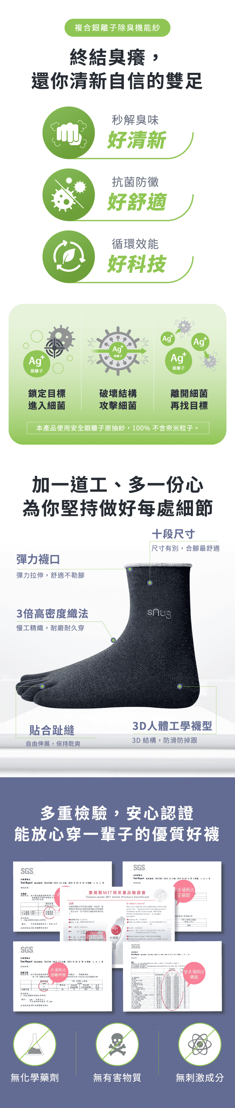 採用專利 銀離子環保機能紗,Ag⁺ 4合1 功能:低碳、抗菌、除臭、吸排,兼顧舒適、防護與永續環保。